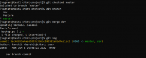 We have made changes in the dev branch and now want to integrate them into the main branch. So first we will checkout to the master branch and then use git merge.
