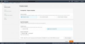 Select “Template is ready ” for “Prepare template” and “upload a templet file” under “Specify templet” , as you can see you can also use a templet stored in S3 bucket, after giving the file path if it’s in s3 bucket/uploading the file if it’s in your local machine , click on next.