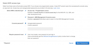 - If you want to give command-line access to the user select Access key – Programmatic access and if you want to give console access select Password – AWS Management Console access. We can select both as well.