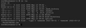You can use “.” instead of mentioning the path “.” means current location. Sometimes we need to look for files or directories in the same location. We can use options “f” for files and “d” for directories with the find command. For instance, if you have a directory and a file named “Books,” you can use it for the directory.