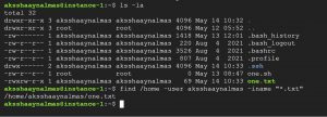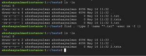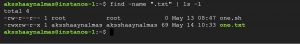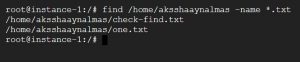 The above given find command searches for all (*) the files with a “.txt” extension in the “/home/aksshaaynalmas” location, as mentioned in the following output.